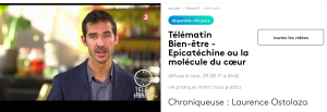 J’ai eu le plaisir d’intervenir à nouveau sur Télématin autour du sujet des épicatéchines et de la prévention cardio-vasculaire (thé vert, cacao, fruits, etc.). Retrouvez le replay pendant